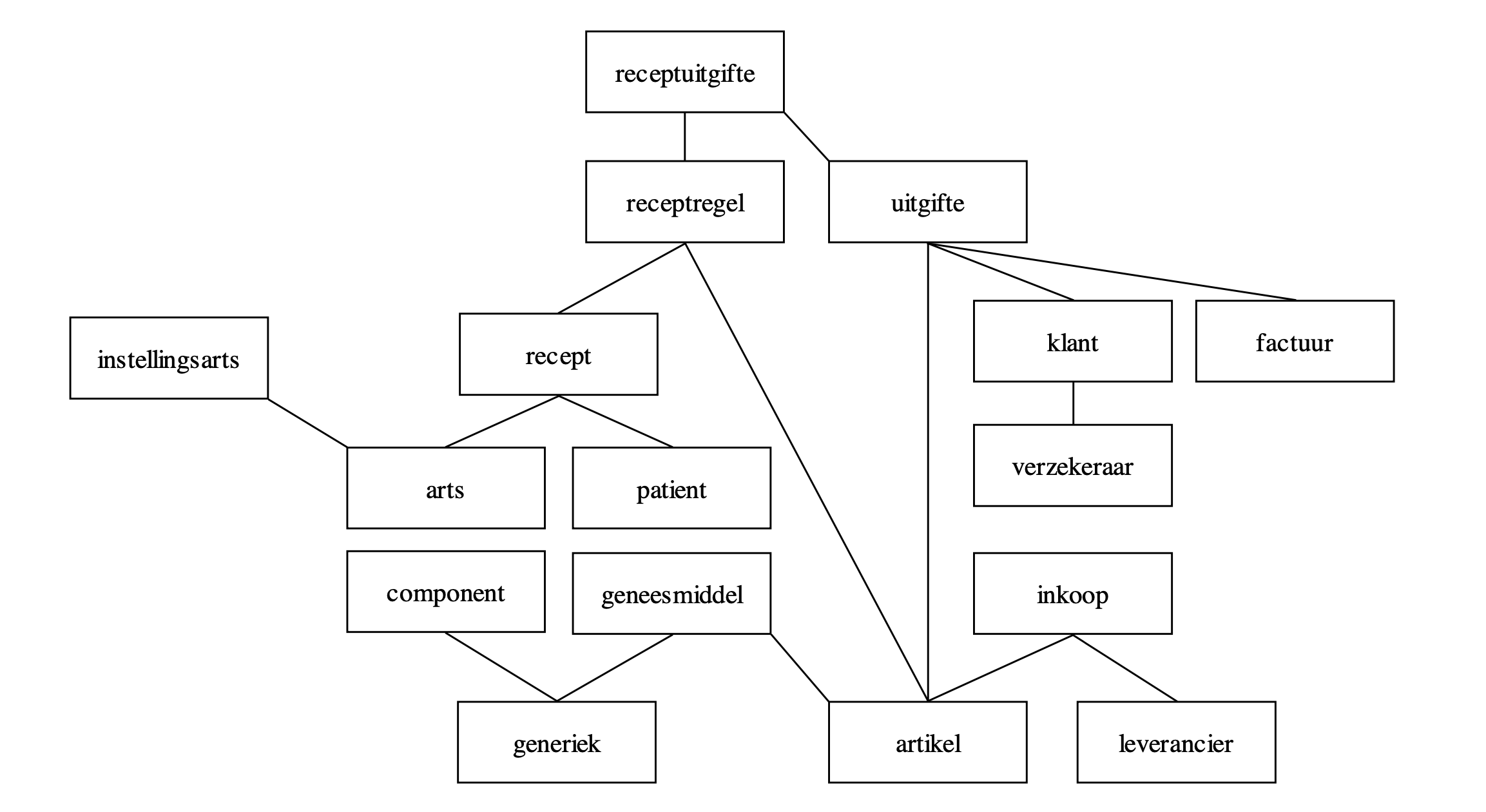 The following diagram depicts the data model of a pharmacy (NL: apotheek) that we made as exercise for the Database design course.